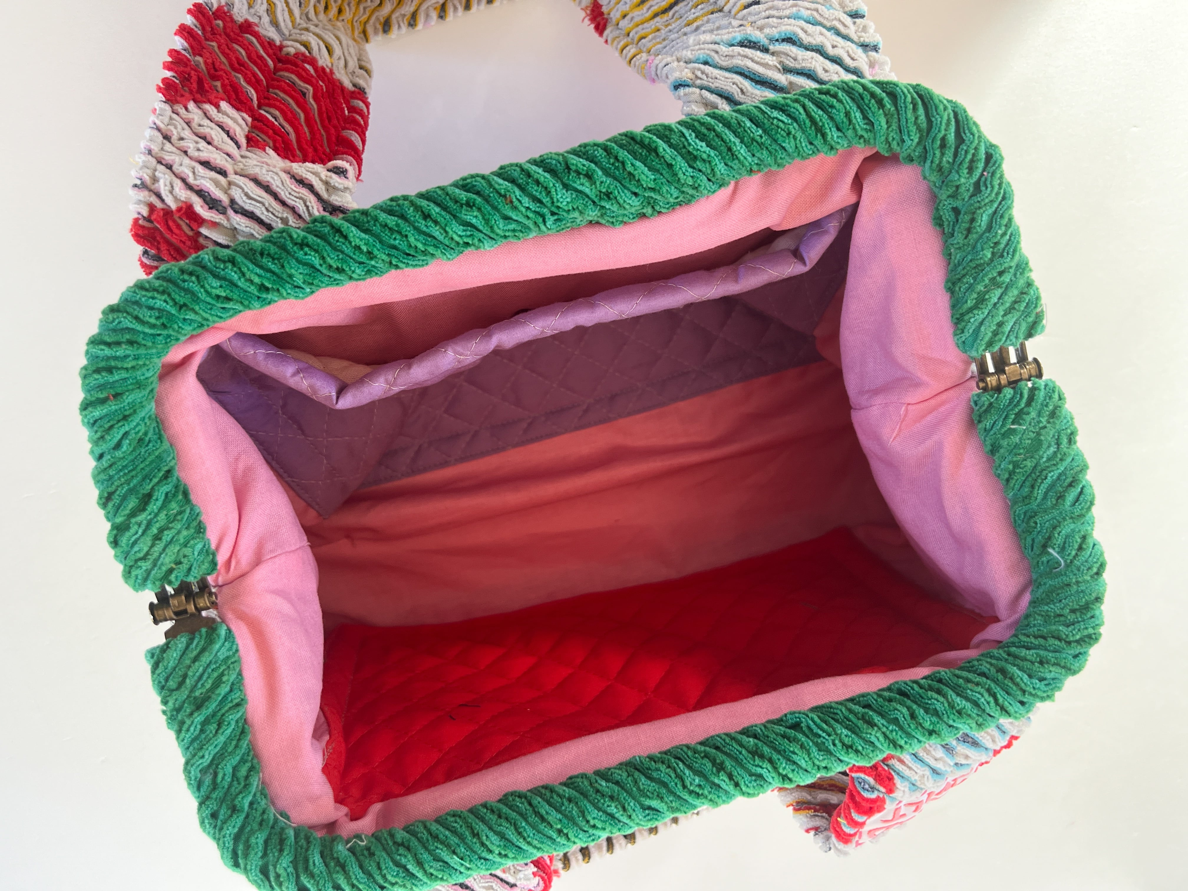 アルミの口金入りでパカっと開くボストンバッグ。コロンとした形が可愛いです。