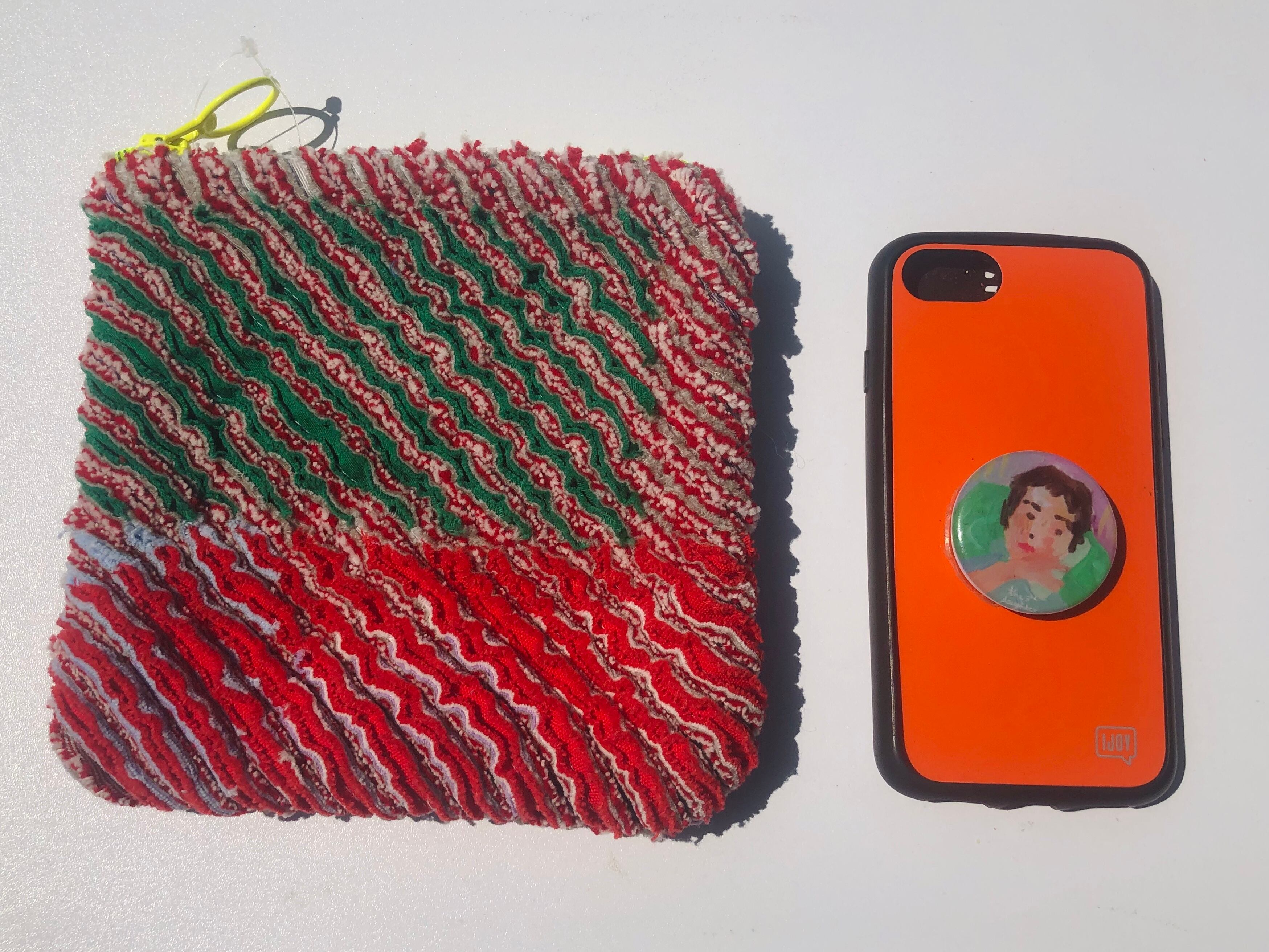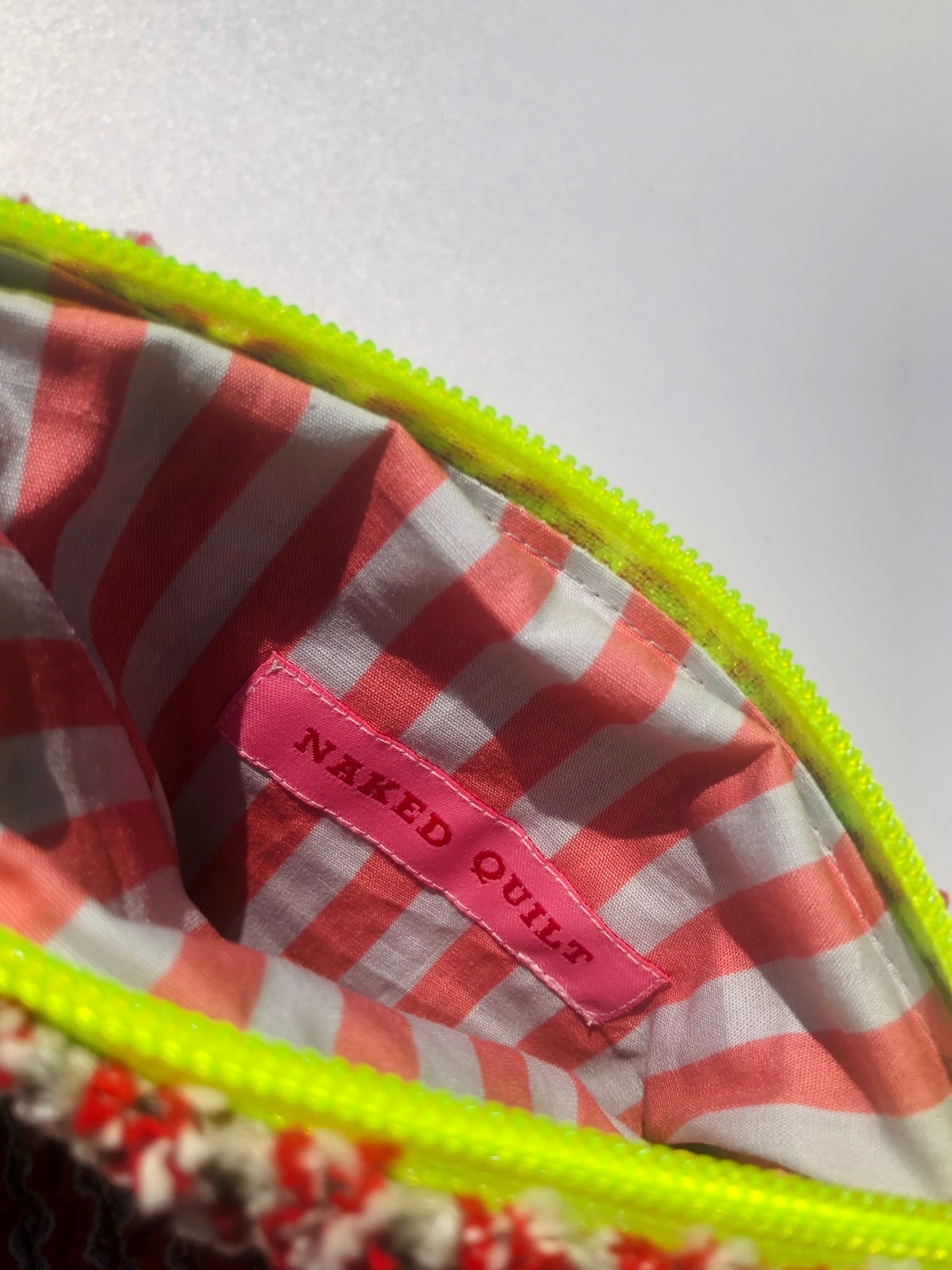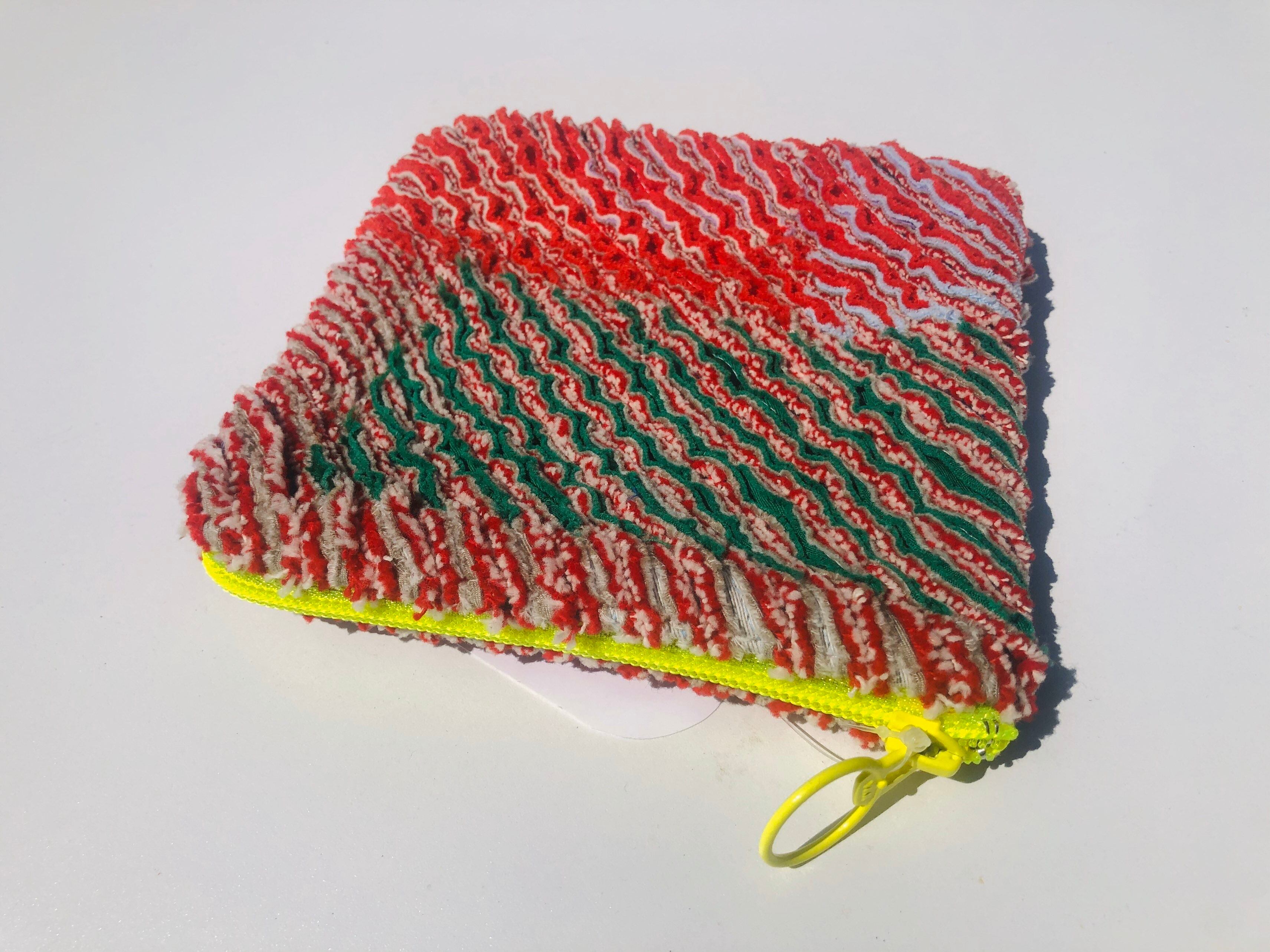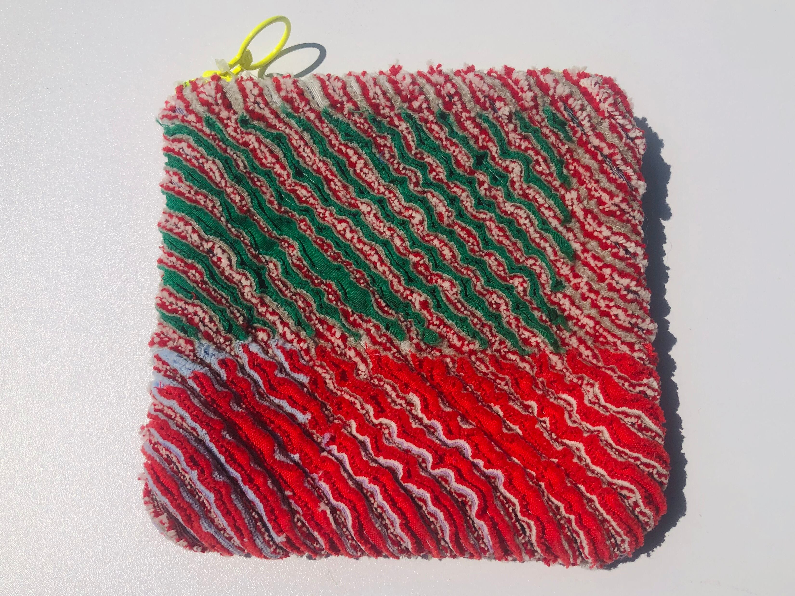 素材から世界に一つの、カラフルなスラッシュキルトのスクエアポーチ。Wi-Fiやモバイルバッテリーケースなどにによく使って頂いています。