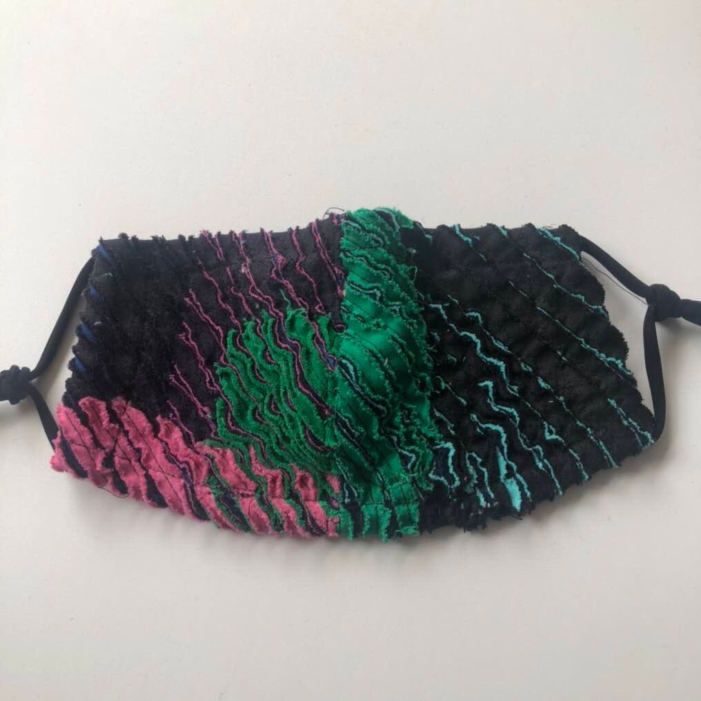 "スラッシュキルトの技法で素材から作られた一点もののマスクです。