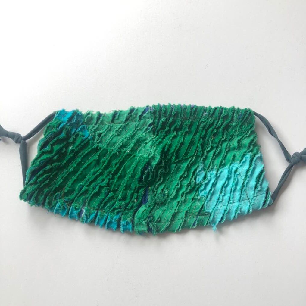 "スラッシュキルトの技法で素材から作られた一点もののマスクです。