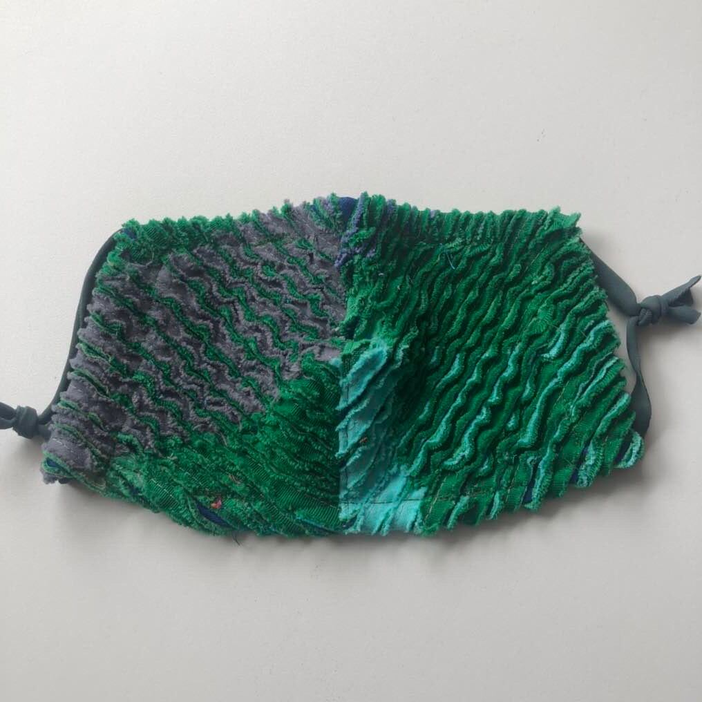 "スラッシュキルトの技法で素材から作られた一点もののマスクです。