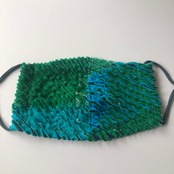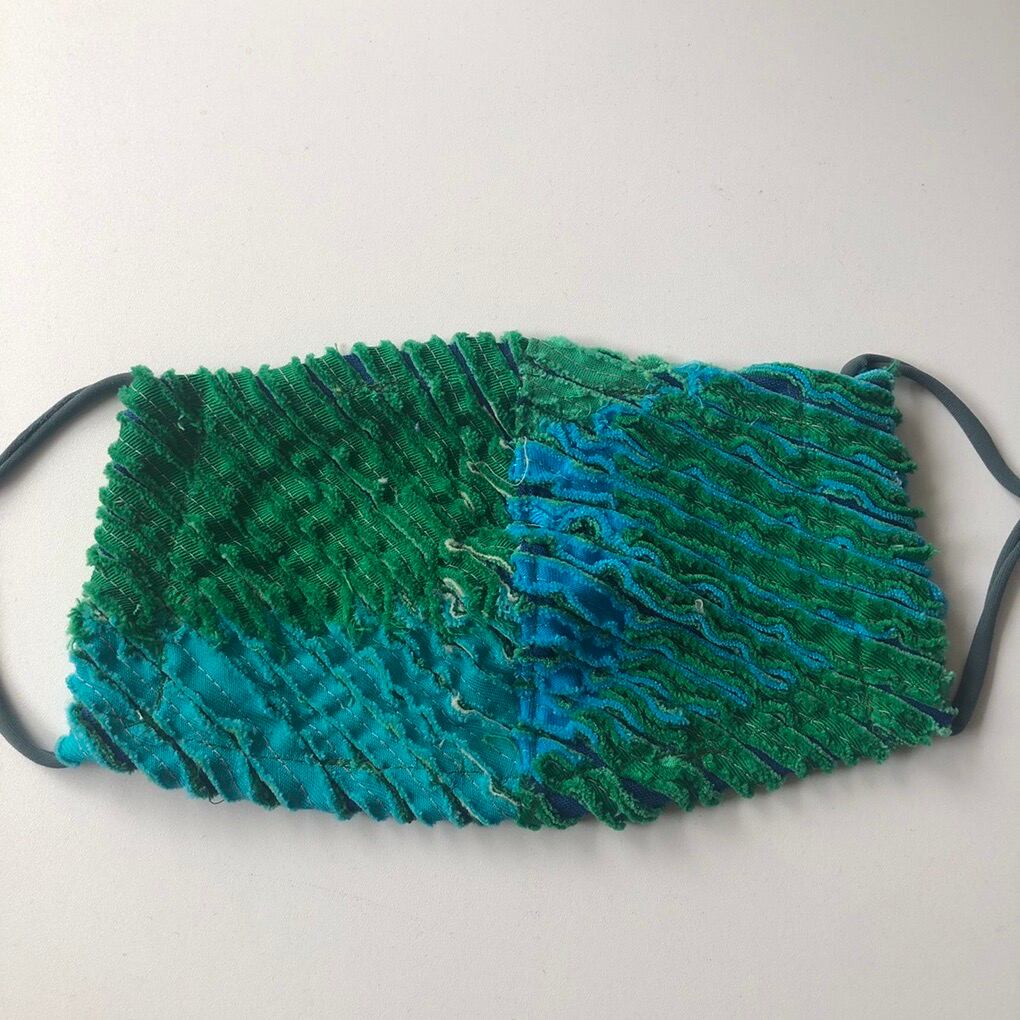 """スラッシュキルトの技法で素材から作られた一点もののマスクです。
