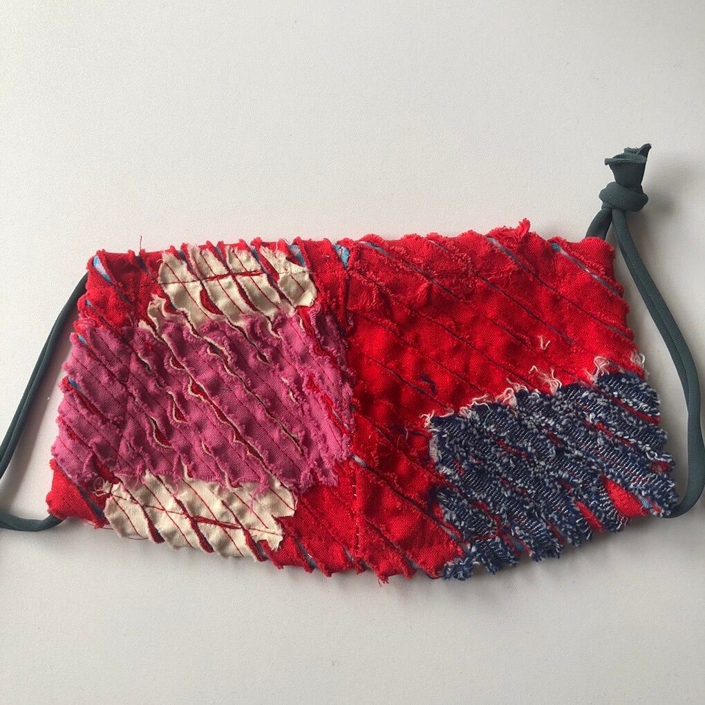 """スラッシュキルトの技法で素材から作られた一点もののマスクです。