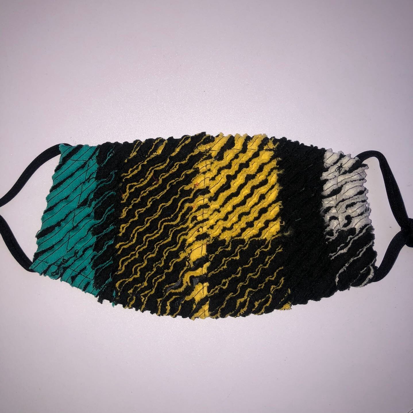 "スラッシュキルトの技法で素材から作られた一点もののマスクです。