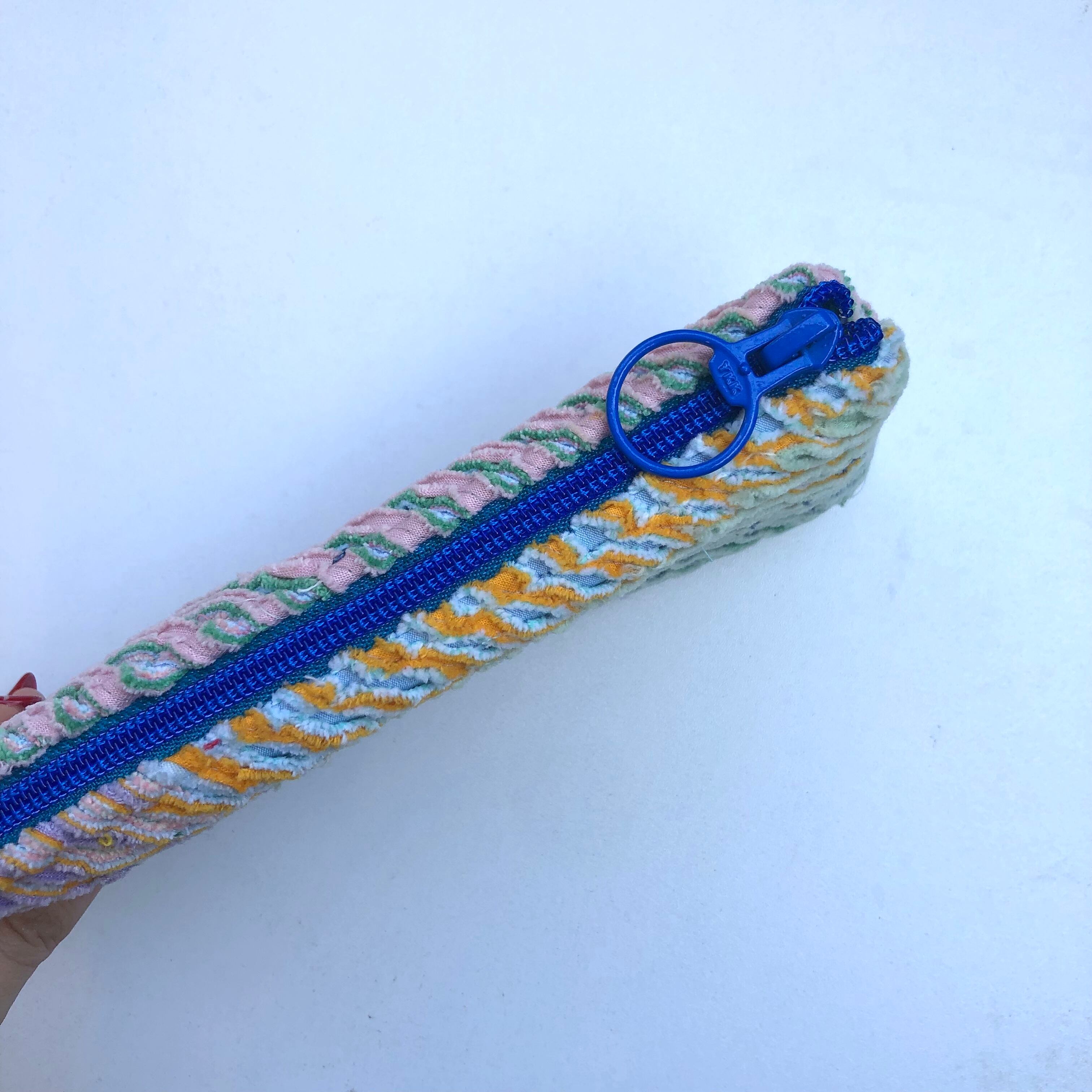素材から世界に一つの、カラフルなスラッシュキルトのポーチ。