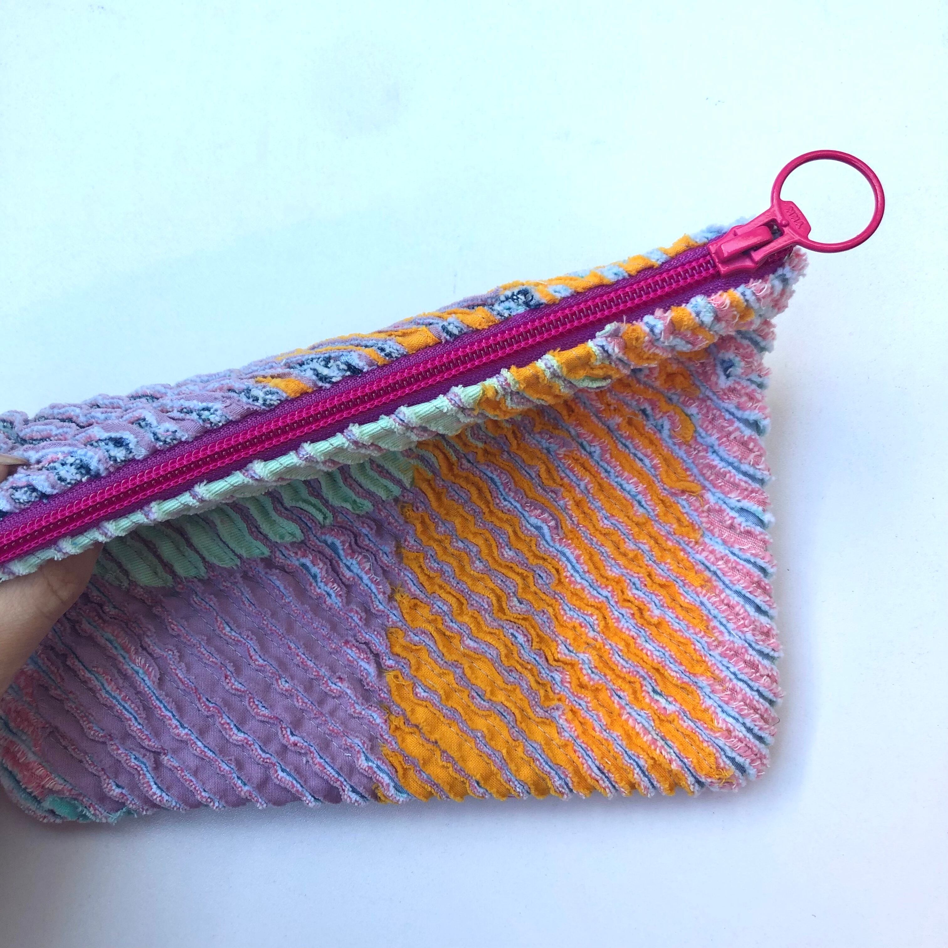 素材から世界に一つの、カラフルなスラッシュキルトのポーチ。