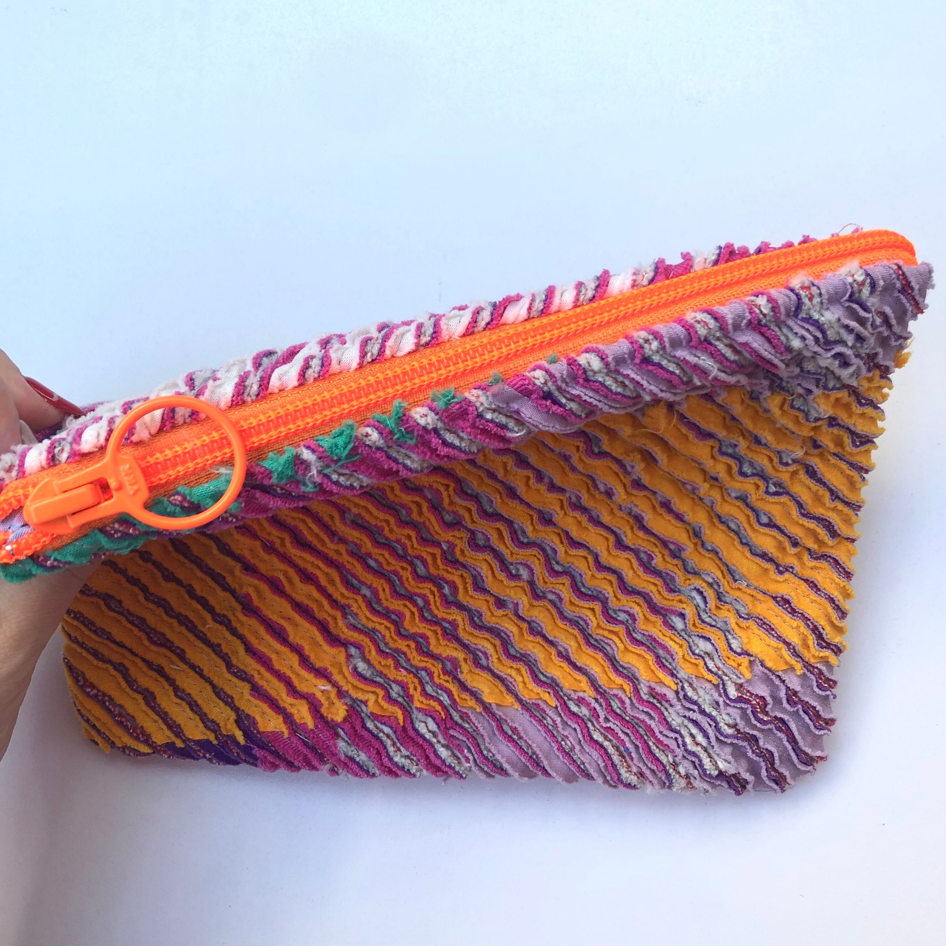 素材から世界に一つの、カラフルなスラッシュキルトのポーチ。