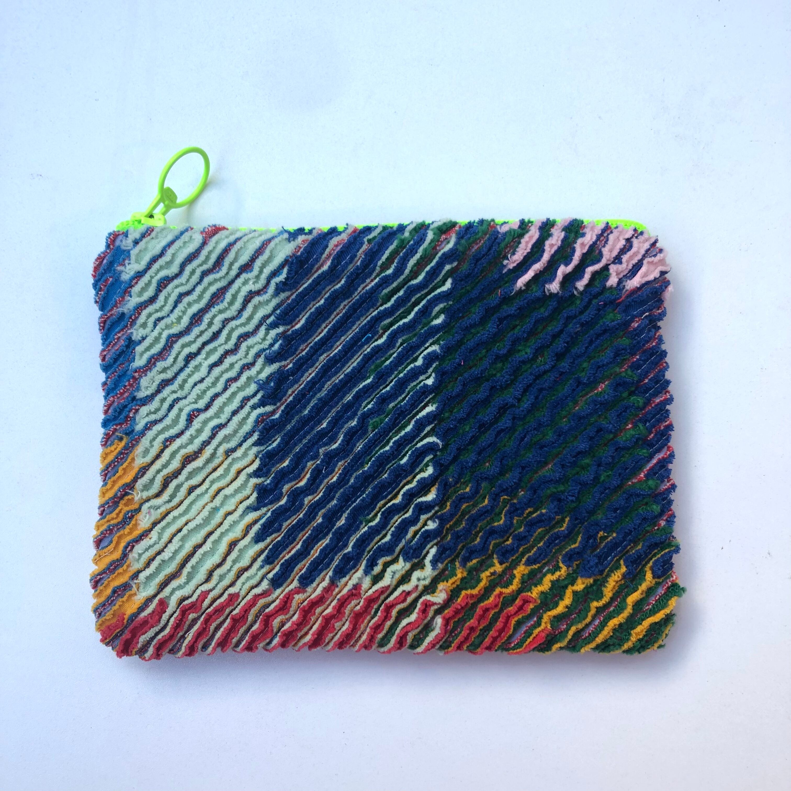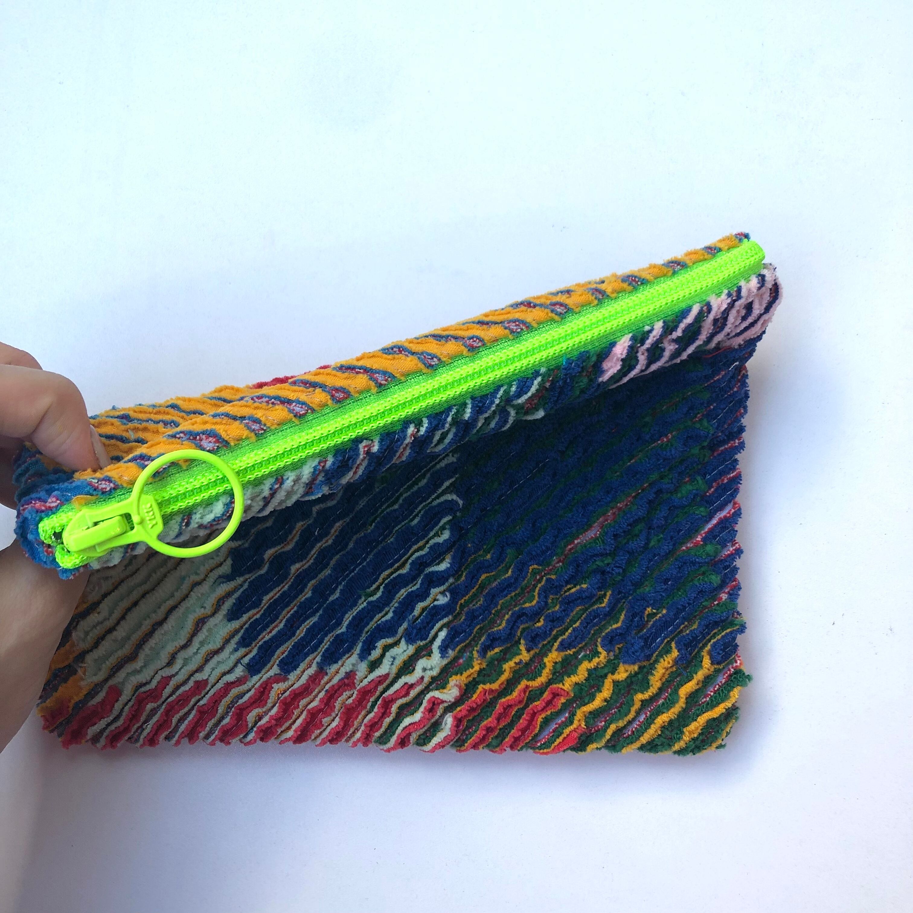 素材から世界に一つの、カラフルなスラッシュキルトのポーチ。