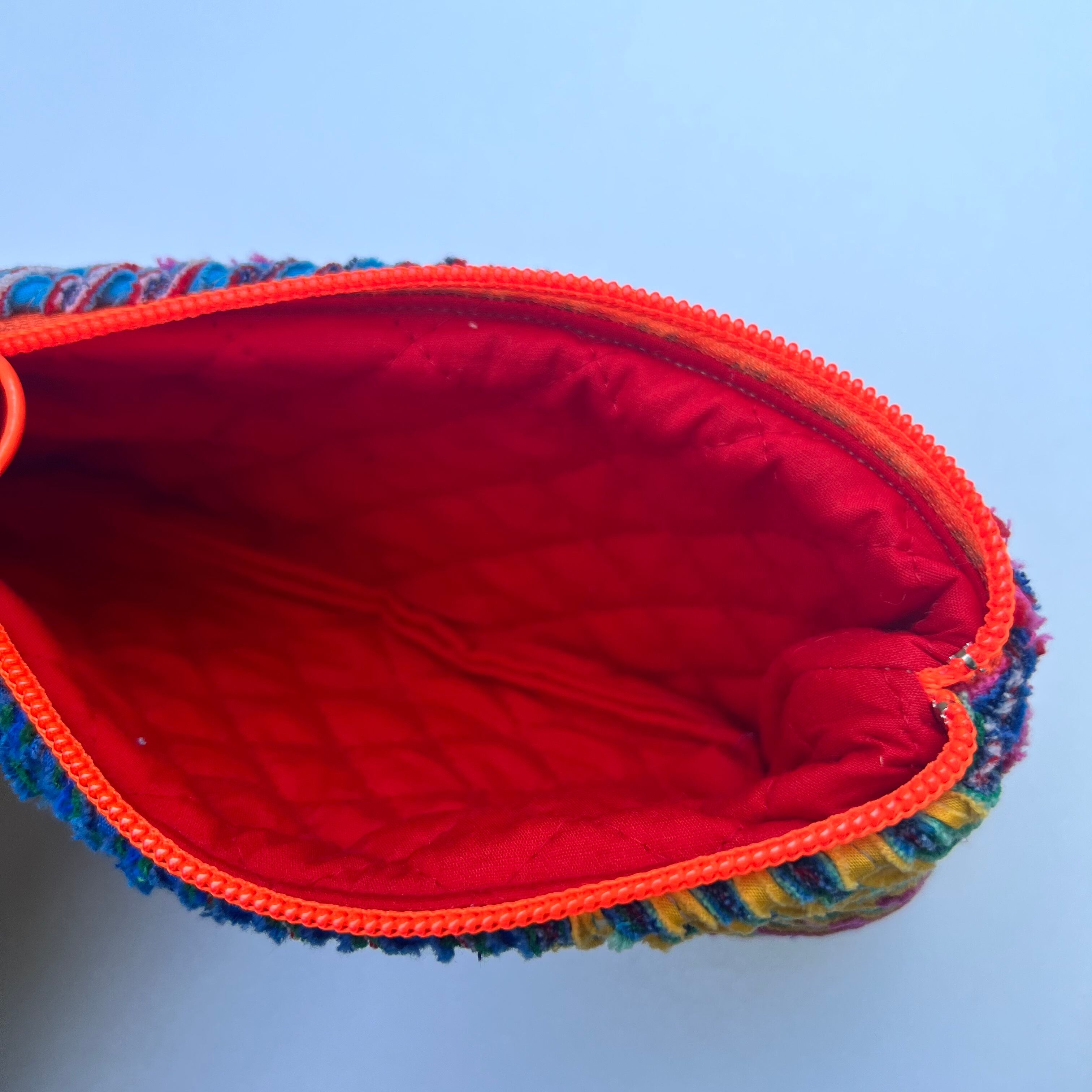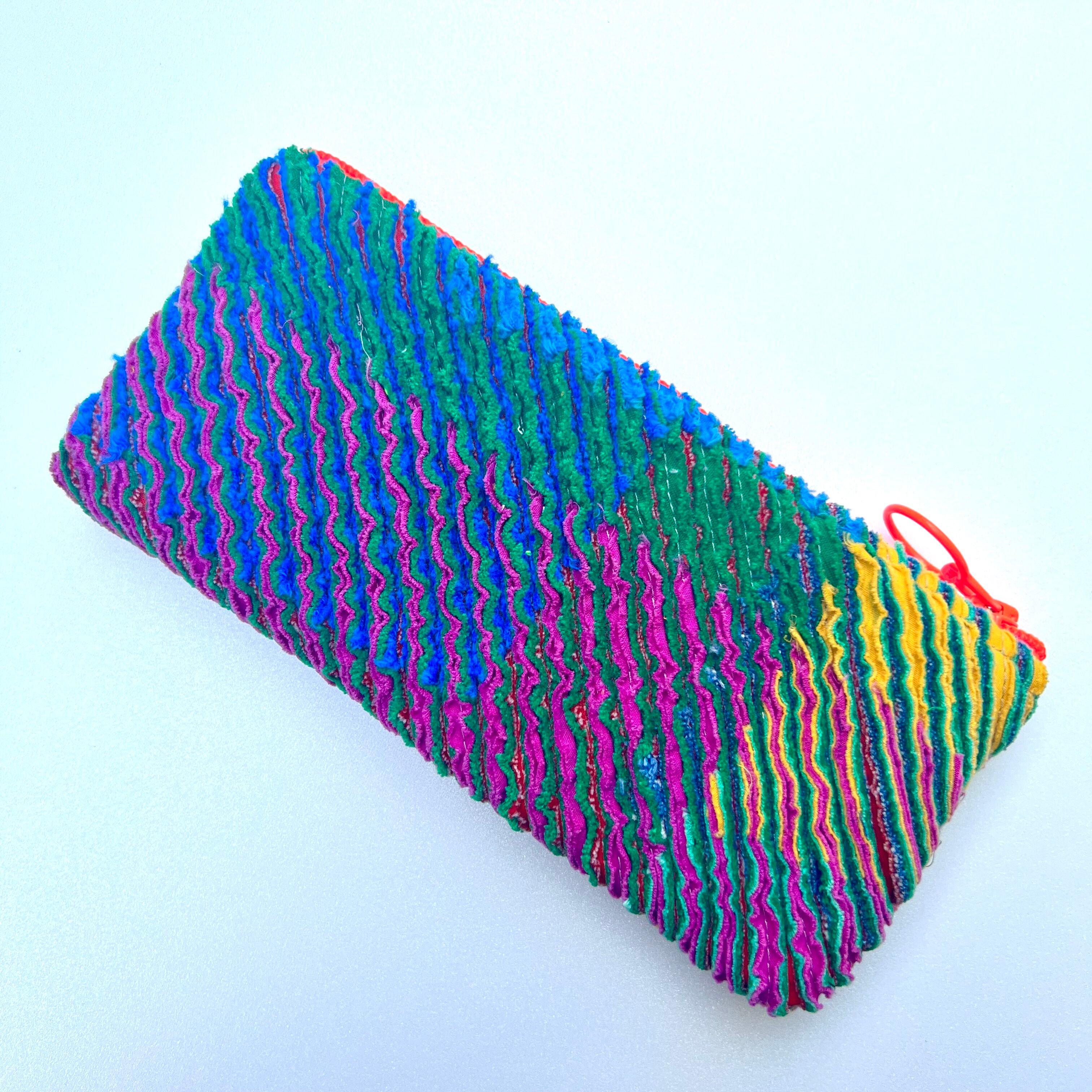 素材から世界に一つの、カラフルなスラッシュキルトのポーチ。