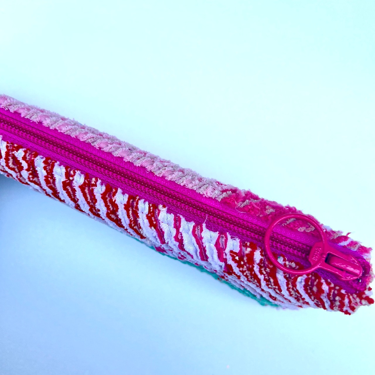 素材から世界に一つの、カラフルなスラッシュキルトのポーチ。