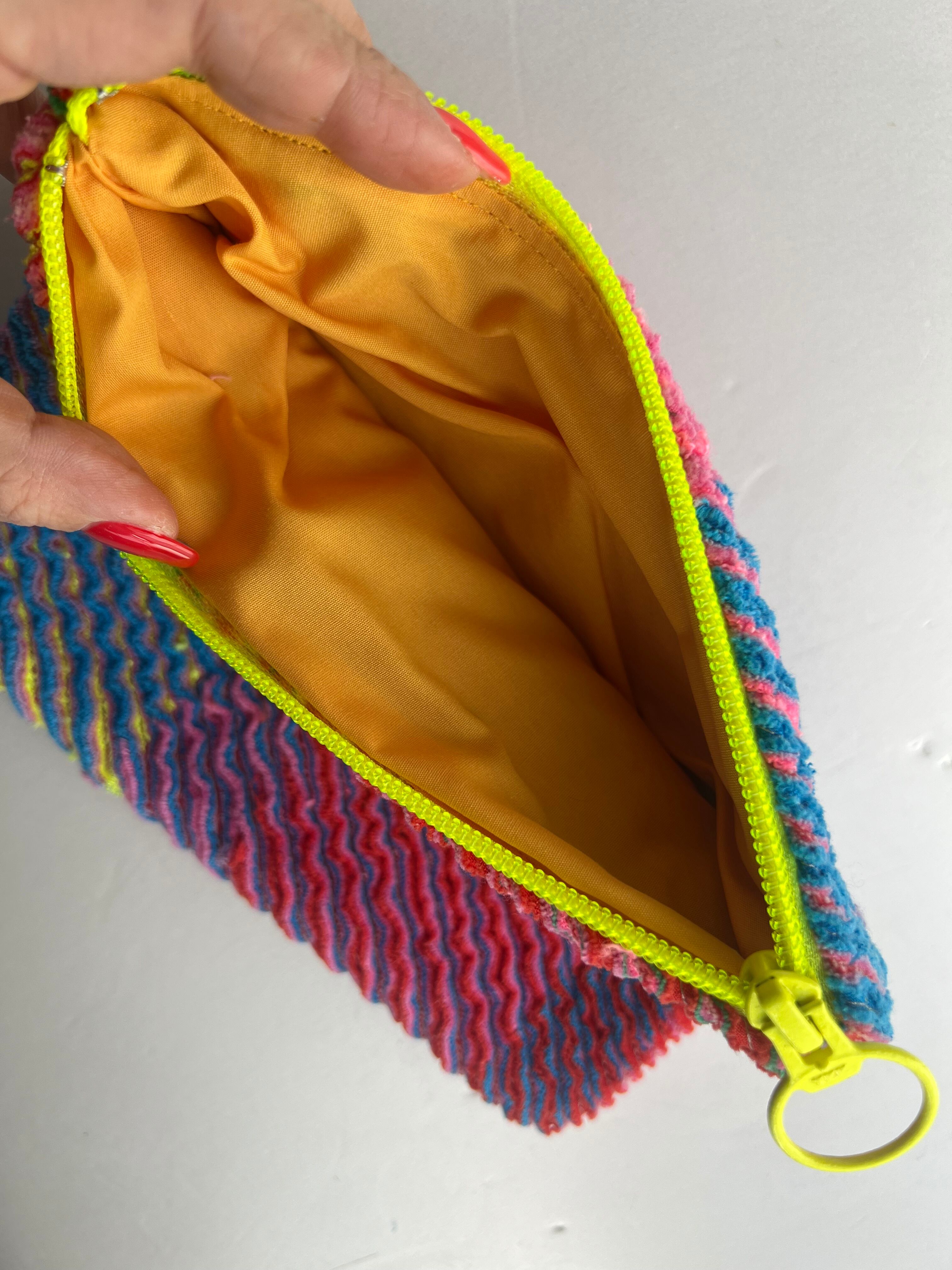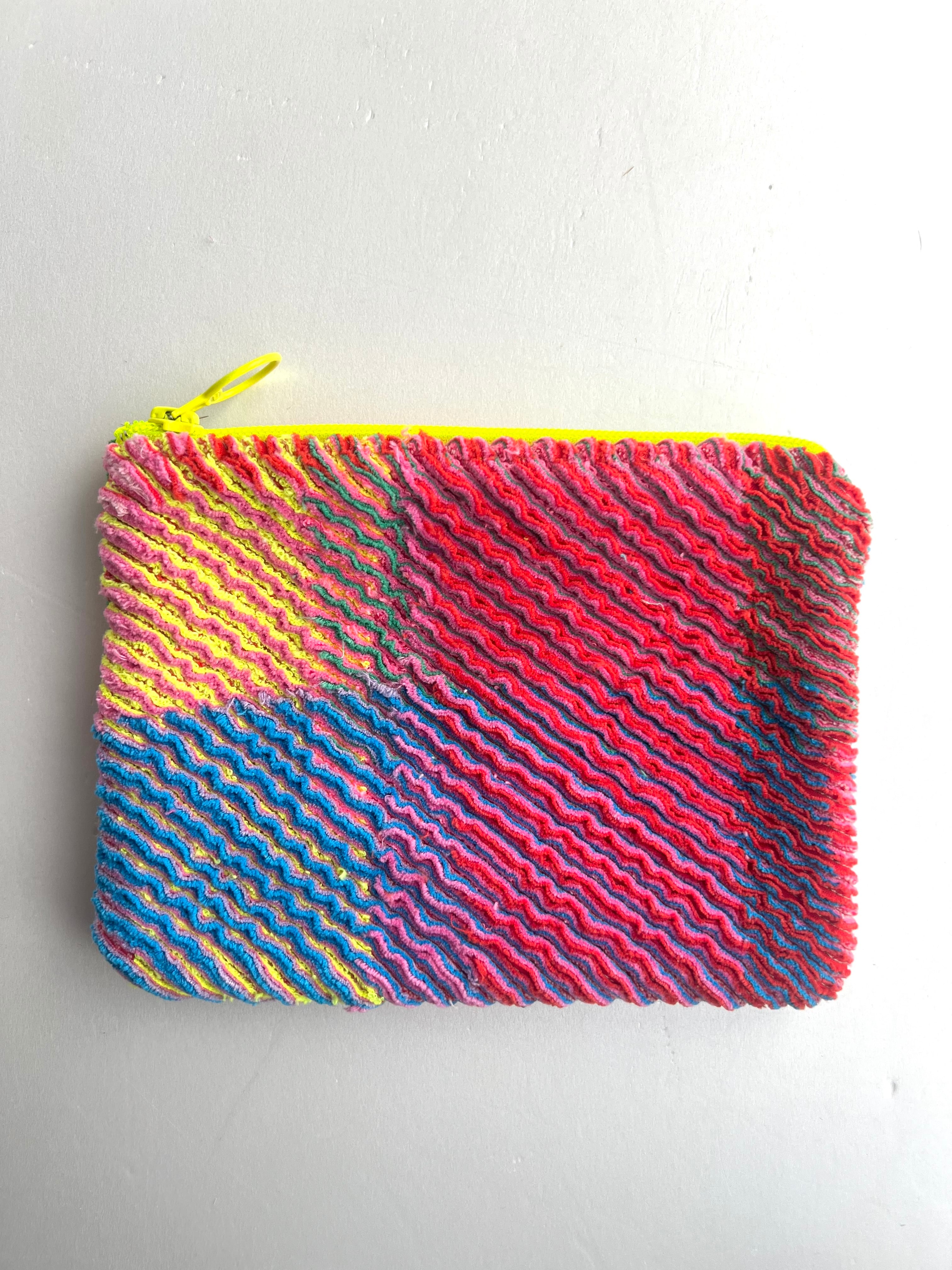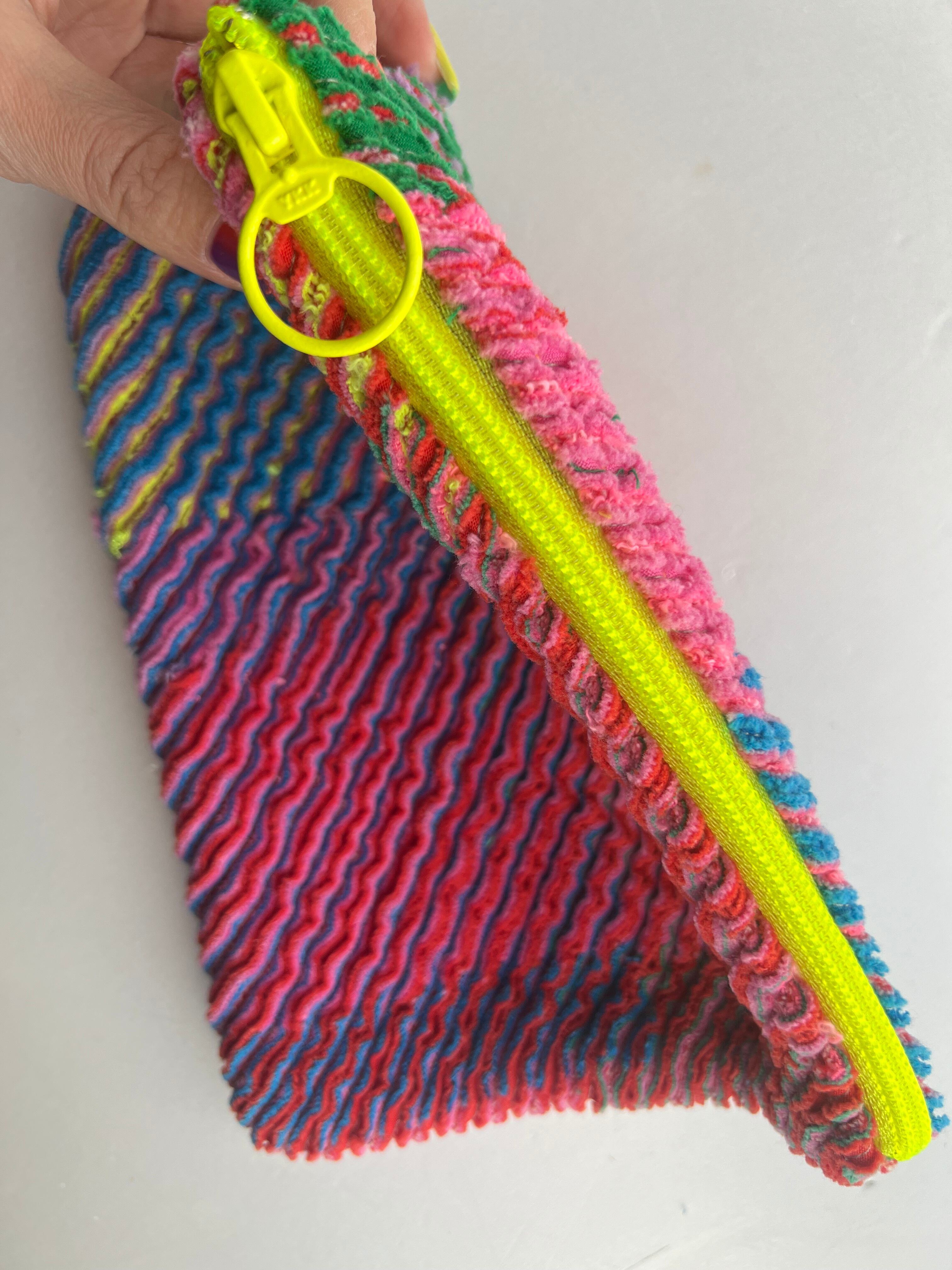 素材から世界に一つの、カラフルなスラッシュキルトのポーチ。